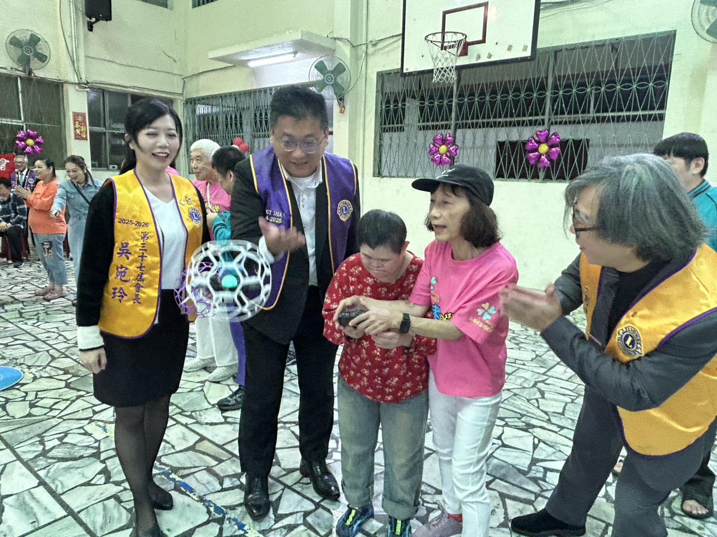 齊佳獅子會會長楊智傑、輔導會吉林獅子會會長吳宛玲,以及前任總監陳字佳獅友、內閣成員與多位獅友們,一同陪伴教養院的院童展開無人機友誼競賽。院童們在專業機師的協助下,體驗無人機的起飛、高度調整與前後操控,成功完成闖關任務,展現專注與自信。