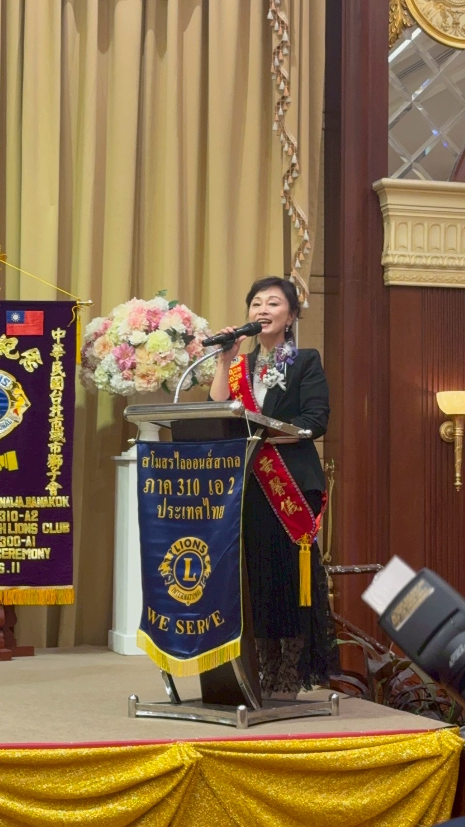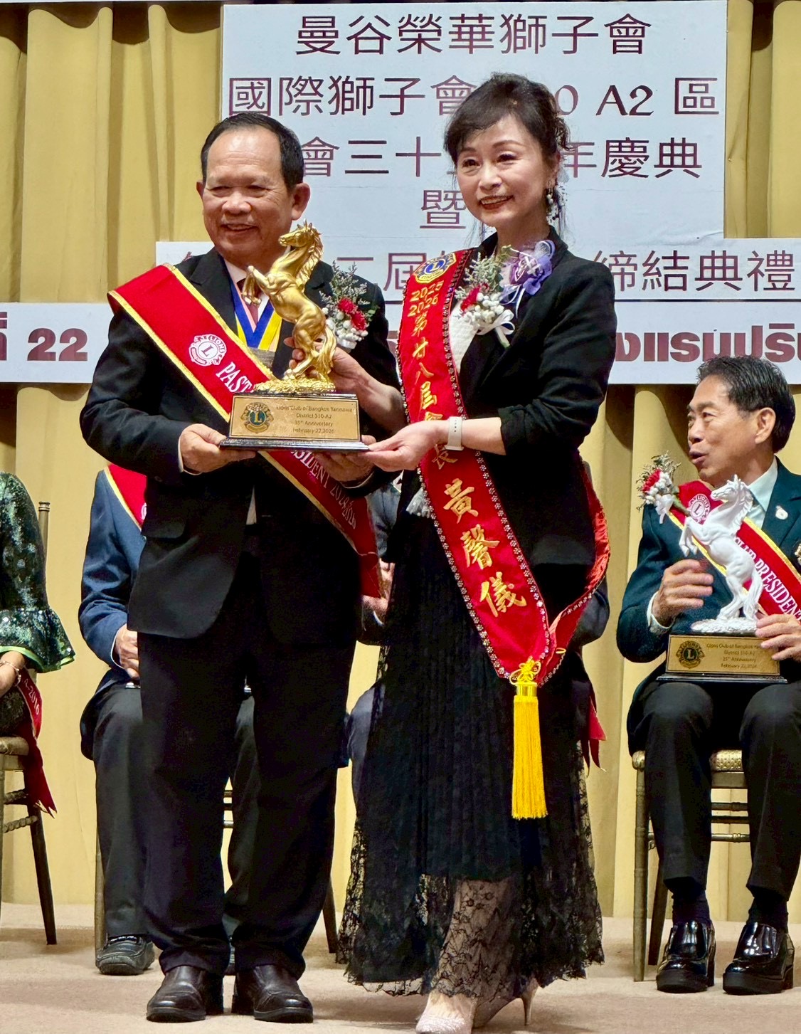22日晚間舉行授證慶典,泰國前國際理事 Pongsak Kedsawadiwong、前議長Peerawat Thamma-uthaitham及各區前總監齊聚一堂,場面隆重盛大。包括榮華會長與前國際理事以及310A2區總監 Nittaya Tianwan等領導人,於致詞中誠摯歡迎台灣獅友蒞臨,強調雙方多年來互信互助,未來亦將持續秉持「We Serve」精神,攜手服務社會、造福人群。