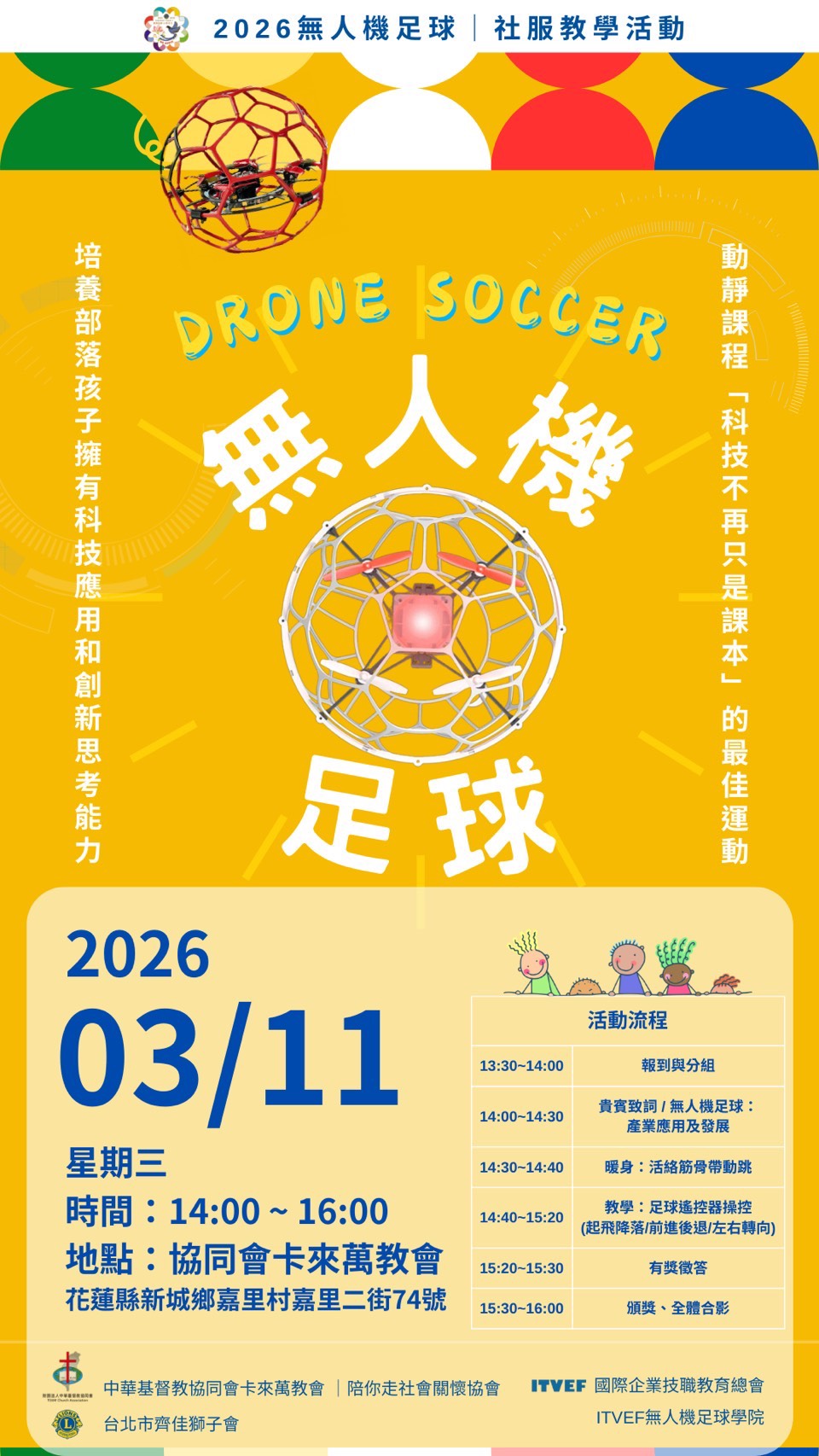 為關懷偏鄉學童並推廣科技教育,台北市齊佳獅子會於3月11日14:00時,在中華基督教協同會卡來萬教會舉辦「無人機足球教學活動」,邀請花蓮新城鄉卡來萬教會的部落學童,一同體驗結合科技與運動的無人機足球。
