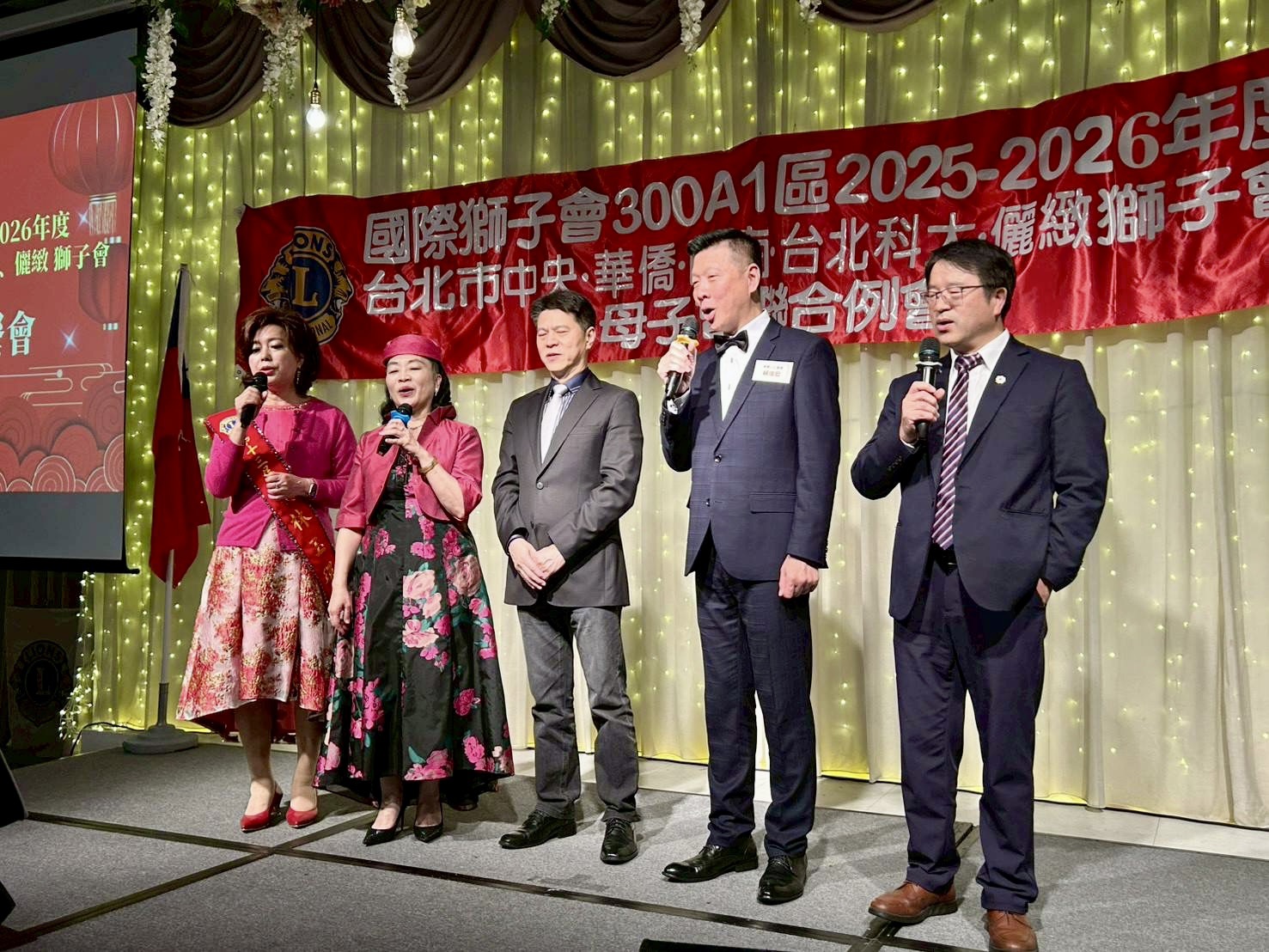 五位會長依序致詞,回顧年度成果,並表達彼此一路相挺的感謝。其中,儷緻獅子會林玉環會長宣布將擴大服務能量,參選2026-2027年度第二副總監,展現持續奉獻的決心。