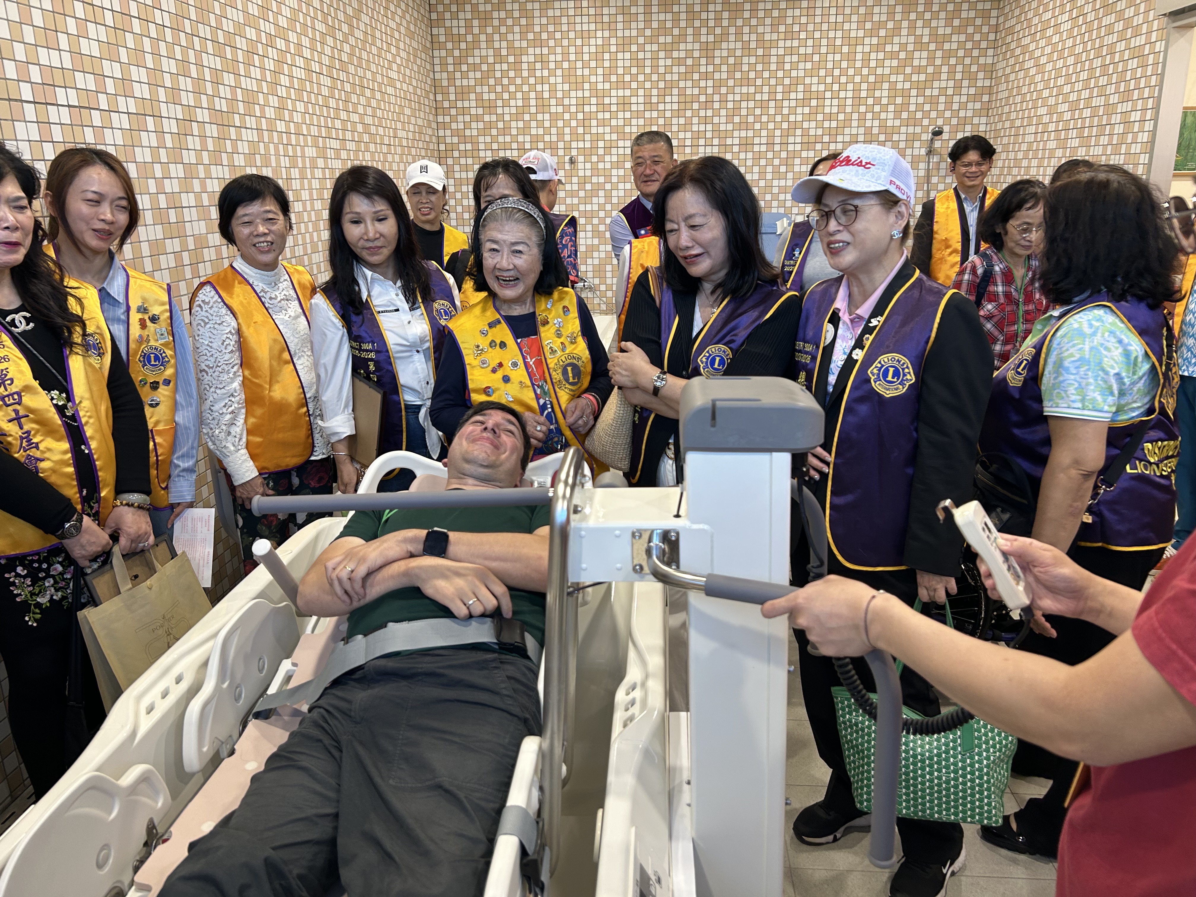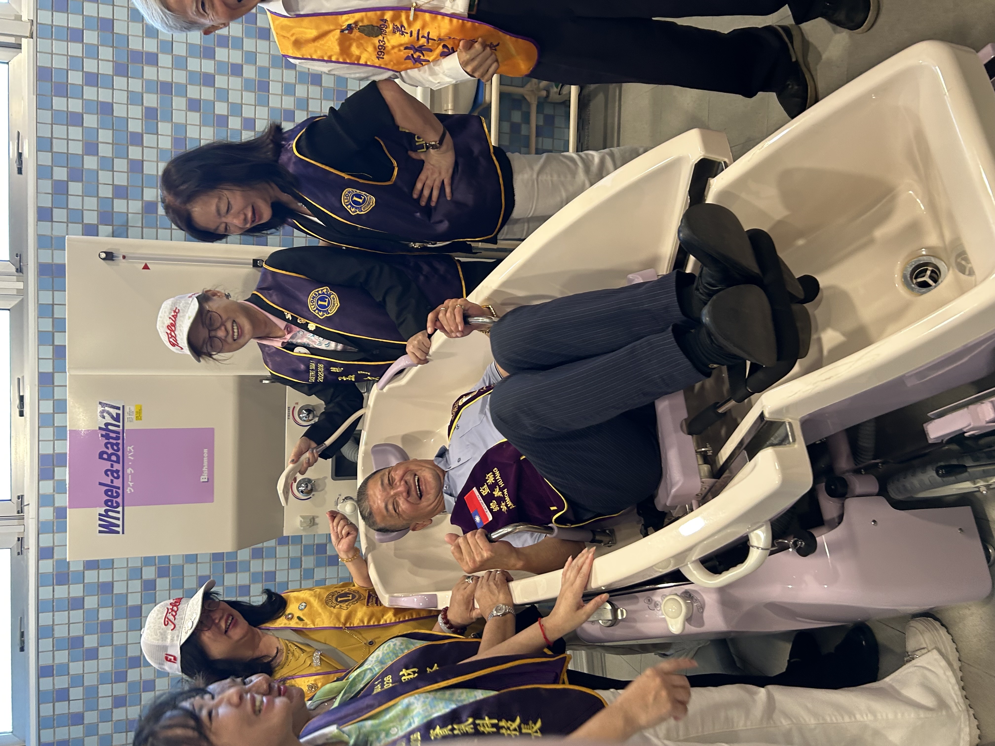 在營運長的引領下,總監與獅友們參觀園區設施。為了照顧行動不便的病友,園內特別設置高安全性與便利性的專用浴缸,讓患者與照護者能安心使用,享有潔淨與尊嚴的生活品質。